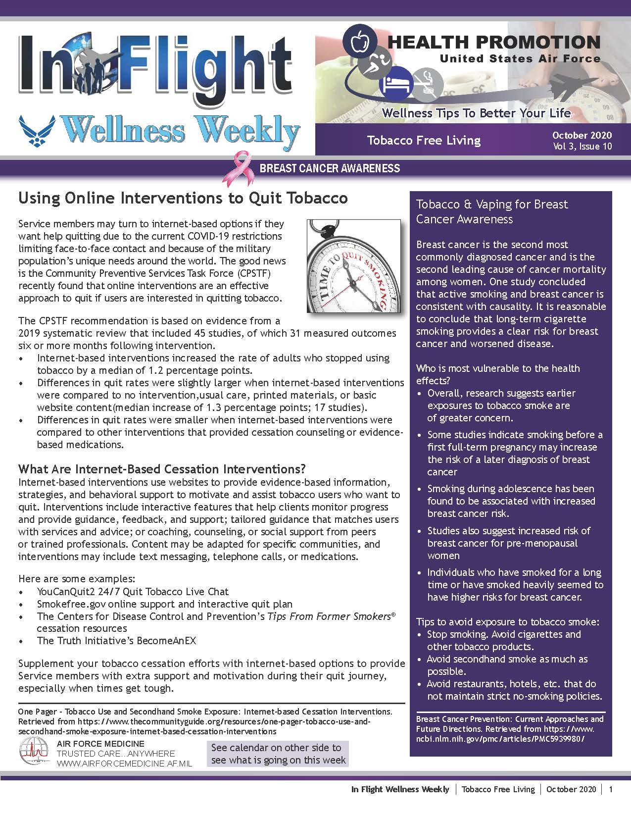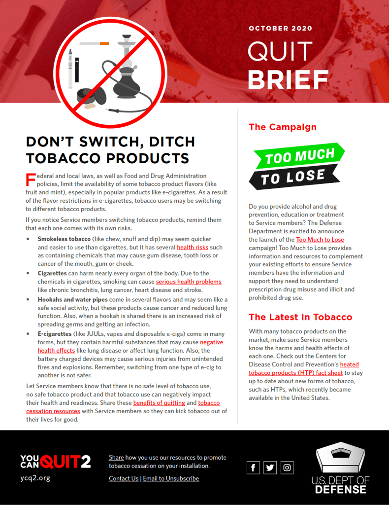 The use of tobacco can increase an individual’s risk of cancer. There are several available services for service members to engage in tobacco cessation, including web-based services due to COVID-19 restriction. There are a few misconceptions about tobacco products, so here is some information regarding tobacco cessation and why ditching tobacco products is better than switching! Below is more information available for download. #BreastCancerAwarnessMonth