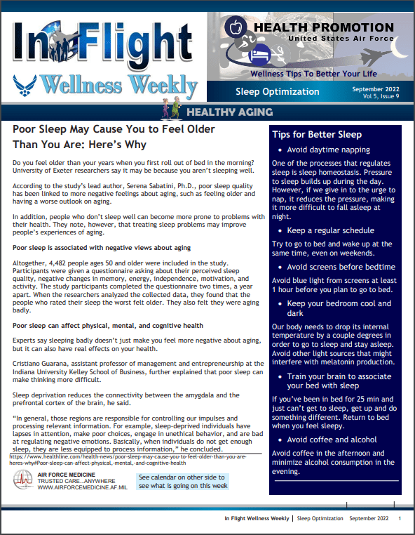 A restful sleep is beneficial for all ages and improper sleep in older populations have been found to have negative health affects. Sleep has been linked to health, wellness, performance, and more. Not getting 7-9 hours of sleep on a regular schedule have been associated with aging, and affect physical, mental, and cognitive health. Download and view the newsletter of the week for more information, tips, and strategies which will help in regulating and scheduling restful sleep.