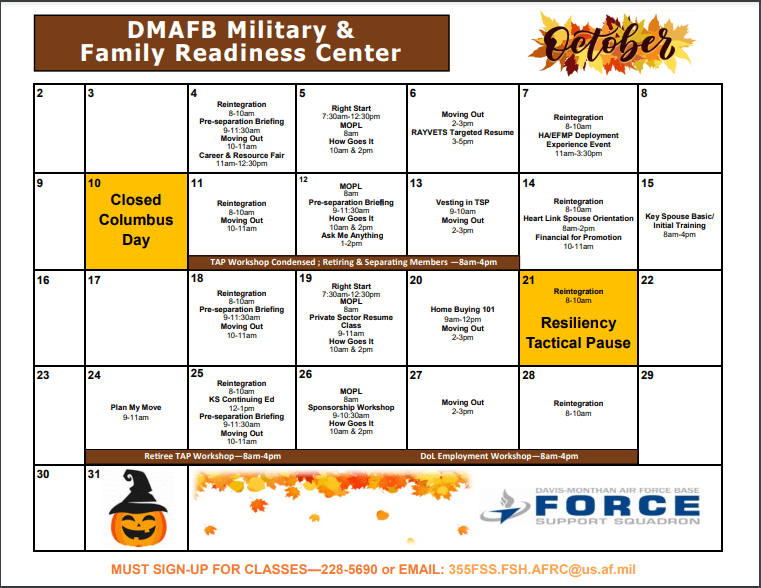 DMAFB Military &Family Readiness Center 5Oct 2022Add a comment Download and view the following calendar for events and resources available for the month of October 2022. Events range from Readiness events to classes about Finance, Career Assistance, and more. oct-22Download Share this: Click to share on X (Opens in new window) X Click to share on Facebook (Opens in new window) Facebook Like Loading... Related