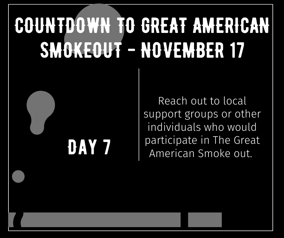 After sharing your pledge to participate in The Great American Smokeout Day search for online communities. Don’t forget to spread awareness and search for the hashtag #GreatAmericanSmokeout.