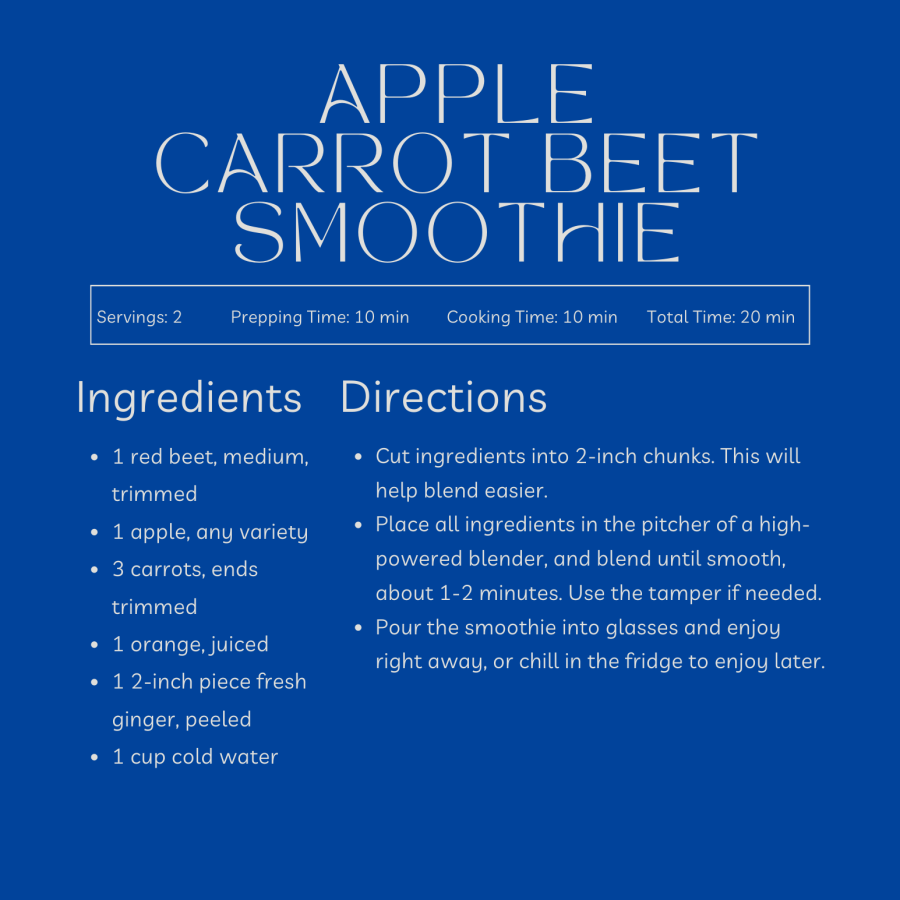 Water is very important, and getting enough water may be tricky if your liquid intake is mostly sugary drinks, sodas, or energy drinks. Water helps normalize your body temperature, lubricate your joints, protect your body by getting rid of wastes, and more. In Arizona, with temperatures outside slowly rising it is very important to monitor your water intake as hotter weather, increased physical activity, and other situations may require increased water intake. Try out this week’s recipe highlighting carrots, which are in season this month in Arizona. Added hydration tip for this week’s recipe: add ice cubes to your smoothie to increase water intake.